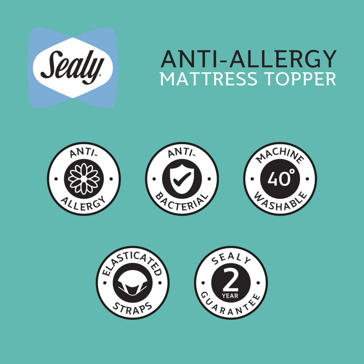 The Sealy Anti-Allergy Mattress Topper is filled with anti-allergy hollowfibre to offer added protection against bacteria to keep your bed fresh, comfortable and hygienic for longer.