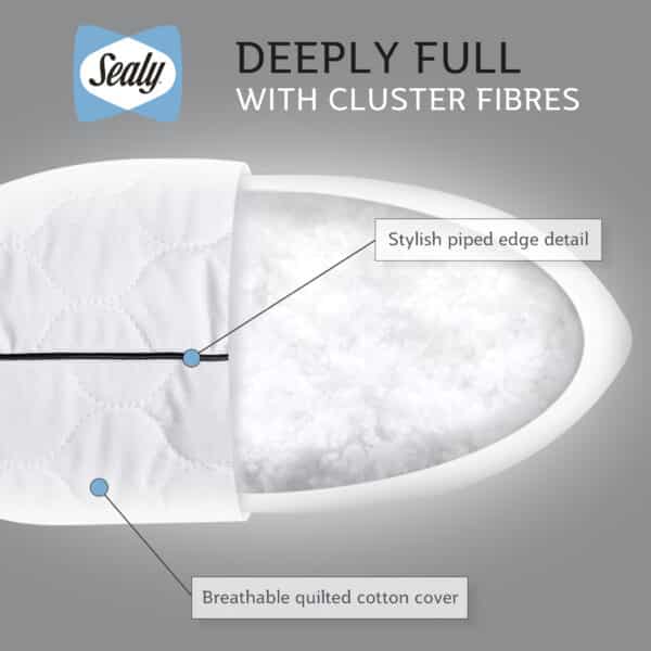 The Sealy Deeply Full Pillow Pair has been expertly crafted to enhance your sleep. Inside the pillows is luxurious Fibadown™ cluster ball filling which offers a soft and silky down-like feeling. Generously filled to offer the ultimate culmination of gentle support for the head and neck along with heavenly comfort.