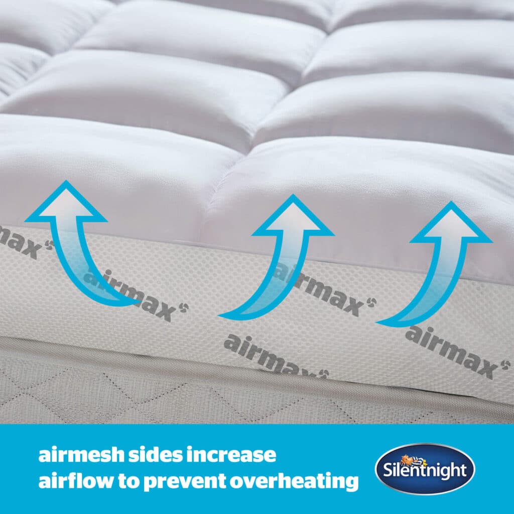 The Silentnight Airmax 1000 Mattress Topper will transform your existing mattress, providing unparalleled breathability for a comfortably refreshing night’s sleep. Specially designed to increase airflow, the Airmax 1000 topper features dual construction which allows air to move freely in-between the layers. The air mesh sides help this air to move freely around your body to keep you comfortable in every season. Deeply filled with hollowfibre, the extra deep 10cm dual layer construction also provides ultimate comfort and will help to refresh and rejuvenate any mattress.