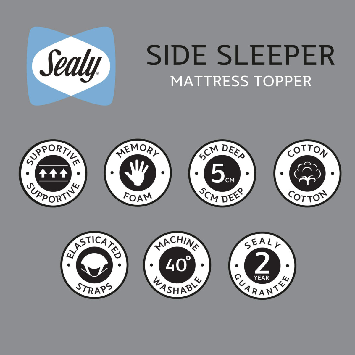 The Sealy Side Sleeper Topper is ergonomically designed to support side sleeping by evenly distributing weight for optimal body and spinal alignment. Adds an additional 5cm of comfort to your mattress with a sink-in memory foam top.