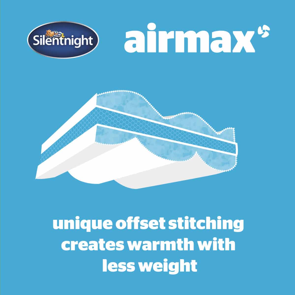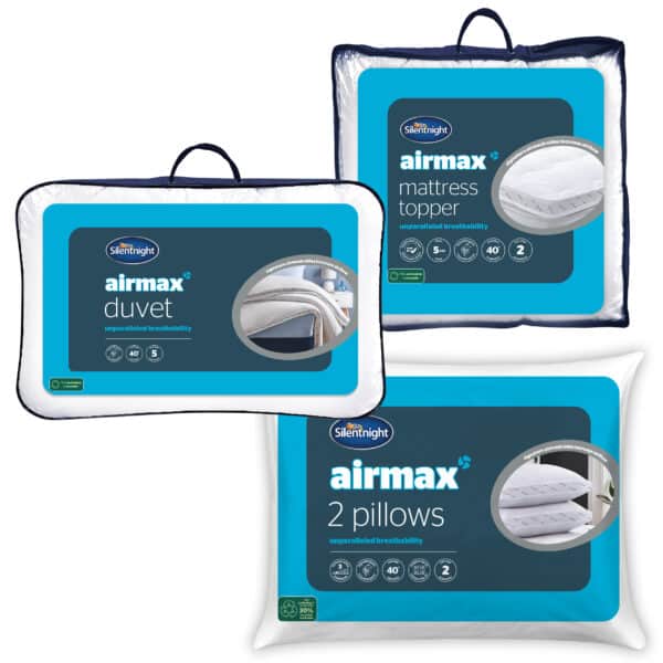 The Silentnight Airmax bundle is made up of 2 Airmax Pillows, an Airmax Duvet and an Airmax Mattress Topper all of which help you sink into deeper sleep.
