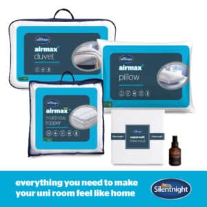 Make your Uni room feel super comfy just like home. This breathable bedding bundle provides unparalleled breathability for a comfortably refreshing night’s sleep. The bundle includes the Silentnight Airmax 13.5 Tog Duvet, Silentnight Airmax 800 Mattress Topper, Silentnight Airmax Pillows, Silentnight Supersoft Fitted Sheet and a Made by Coopers Pillow Spray.