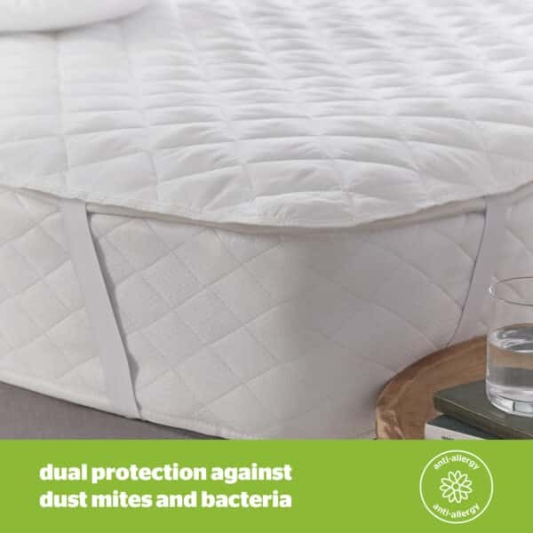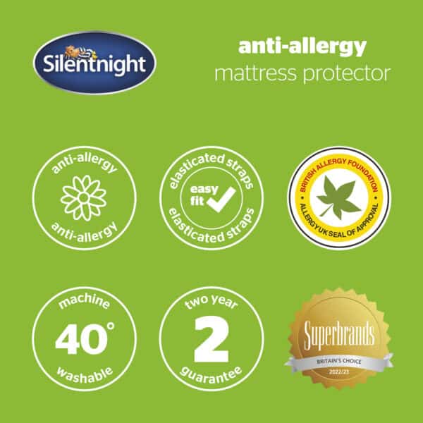 Bundle includes 2 Silentnight Anti-Allergy Mattress Protectors. Each Silentnight Anti-allergy Mattress Protector is filled with anti-allergy hollowfibre that actively protects against bacteria and dust mites. This helps to prevent allergies and keep your bed feeling fresh and clean, whilst keeping you comfortable for a restful night’s sleep. Our anti-allergy fibres are approved by the British Allergy Foundation, which means they have the ultimate seal of approval. Our fibres have been scientifically tested and are proven to reduce or remove allergens from the indoor environment. The mattress protector will protect and prolong the life of your mattress, helping to shield spills, stains and general wear and tear.
