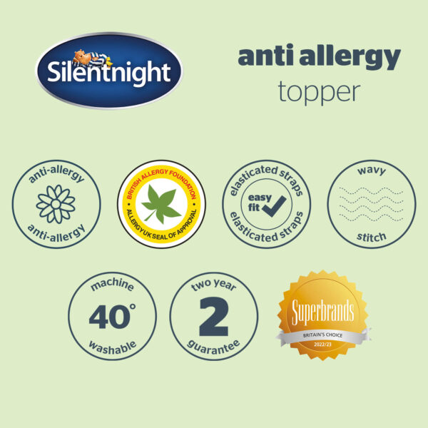 The Silentnight anti-allergy mattress topper is filled with anti-allergy hollowfibre that actively protects your bed from bacteria and dust mites to help prevent allergies.