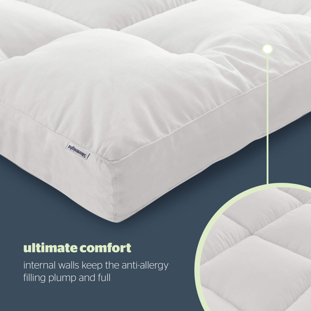 The Silentnight Anti-Allergy Ultimate Mattress Topper is filled with anti-allergy hollowfibre that actively protects your bed from bacteria and dust mites to help prevent allergies. Extra 10cm depth provides ultimate comfort, while the quilted cover with internal walls keeps the anti-allergy filling evenly distributed, ensuring lasting support and a consistently plump feel.