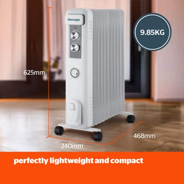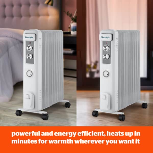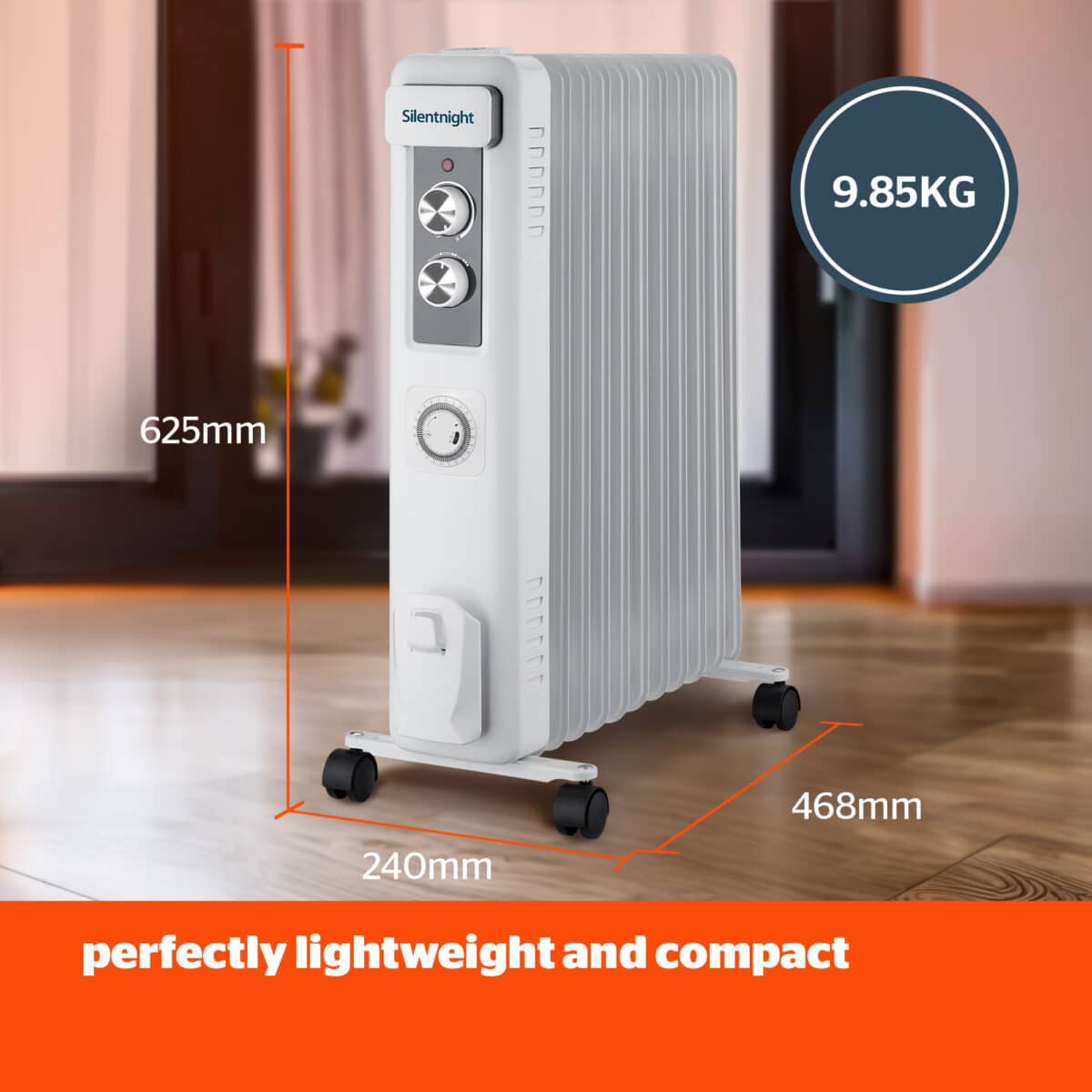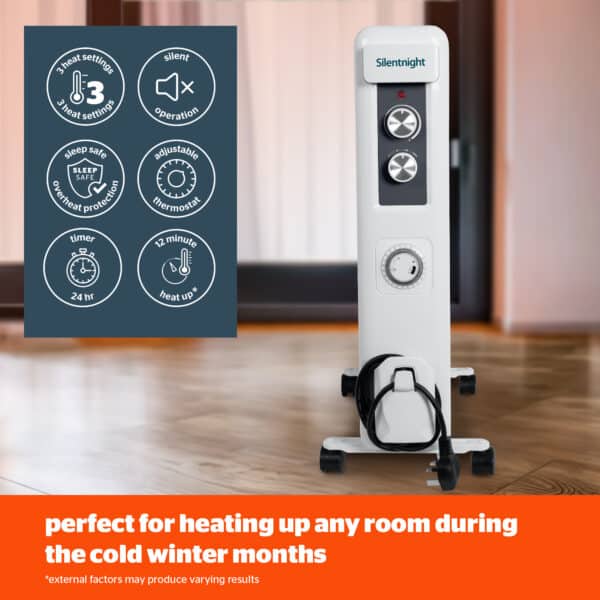For warmth wherever you want it, the portable Silentnight Comfort Control 11 Fin Oil Filled Radiator is easy-to-use, has adjustable heat settings and a 24-hour timer for ultimate control and is equipped with protection features that keeps you and the family cosy and safe, during the day and night.