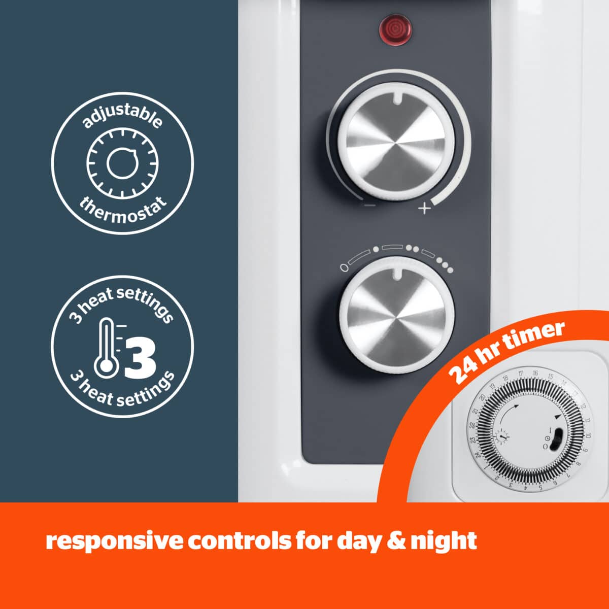 - RESPONSIVE CONTROLS FOR DAY & NIGHT: Featuring 3 heat settings, an adjustable thermostat and a 24-hour timer, so you can control your comfort through the day & night.
