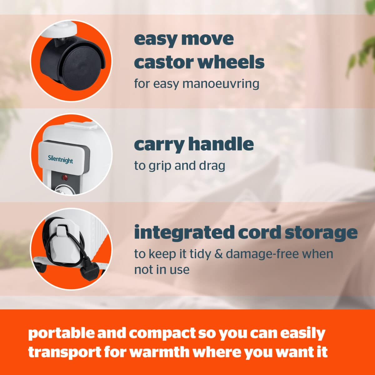 - PORTABLE: Free standing and compact, featuring easy move castor wheels, carry handle and integrated cord storage so you can easily transport for warmth where you want it.