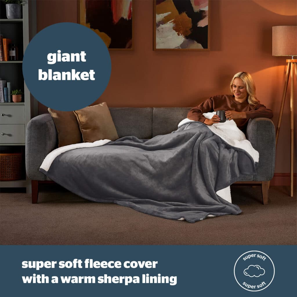 - SUPERSIZED SNUGGLY COMFORT: The Snugsie Giant Blanket is sumptuously soft with a warm Sherpa fleece inside for extra cosy vibes! A whopping 180 x 240cm – it's bigger than a king size bed and perfect to shroud yourself in ultimate snuggly comfort.