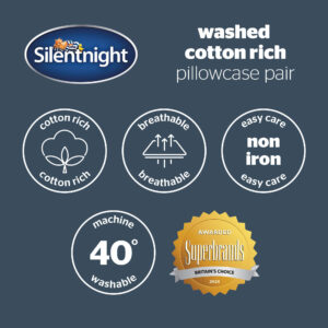 The Silentnight Washed Cotton Rich Pillowcases is crafted with a blend of natural washed cotton and polyester combining luxurious softness & easy-care properties. The washing process, to give the cotton a luxuriously soft feel, means that there could be slight shade variations. Its breathable, stylish linen-look ensures comfort throughout the night. The pillowcases are easy to care for and will retain their shape wash after wash. The washing process, to give the cotton a luxuriously soft feel, means that there could be slight shade variations.