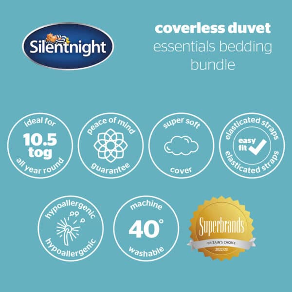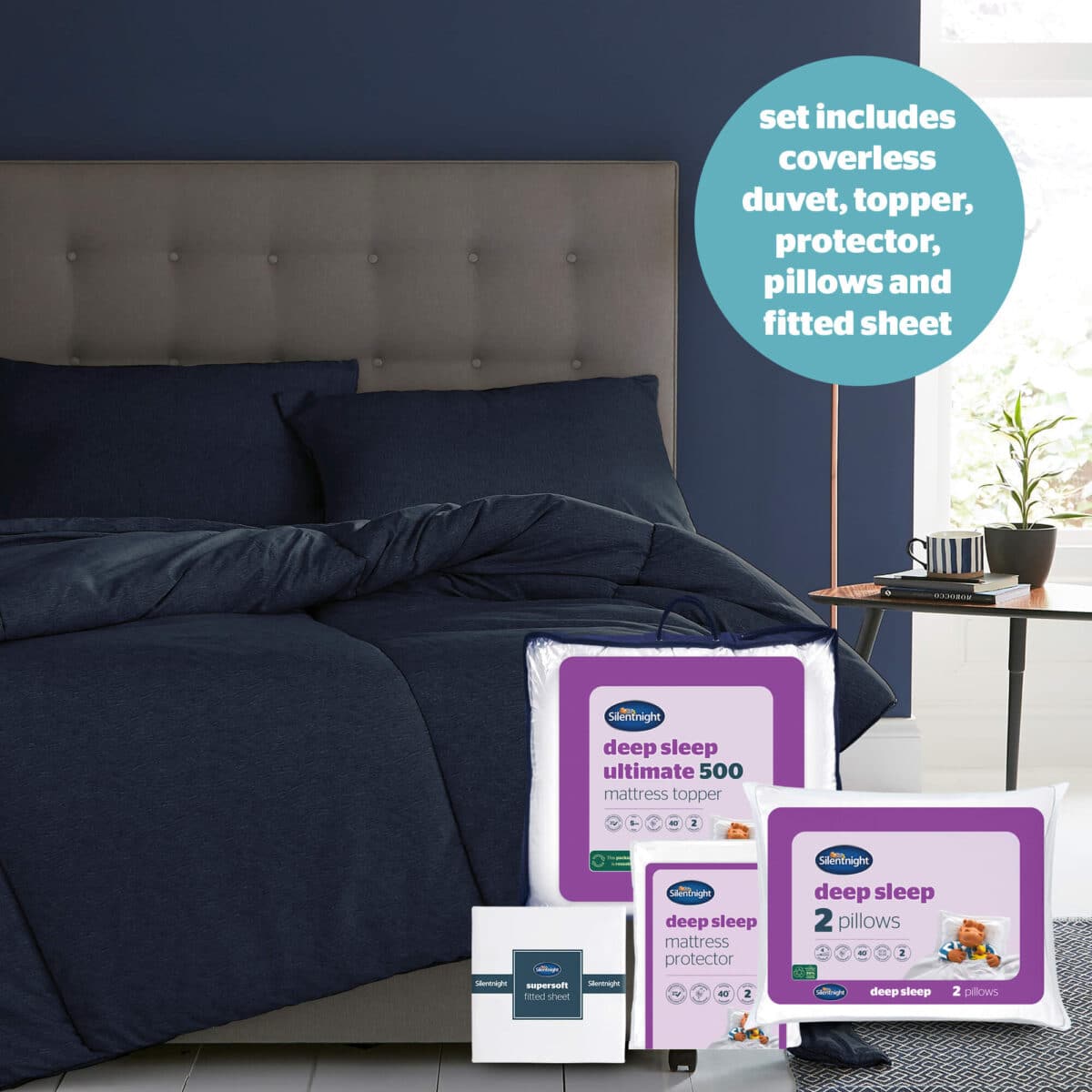 - BACK TO UNI ESSENTIALS: This bundle features essential sleep comforts for university life, including a Silentnight Coverless Duvet Set, Deep Sleep Mattress Topper, Mattress Protector, Pillow Pair, and Supersoft Fitted Sheet. Everything you need to make your Uni room feel like home.