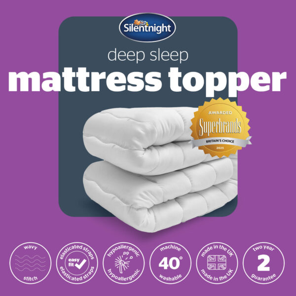 Sink into deeper sleep. Generously filled for endless comfort and support, helping you to sleep more deeply every night. The Silentnight Deep Sleep Mattress Topper is generously filled with hollowfibre and covered in soft microfibre which results in a soft, cosy topper that provides gentle support and adds an extra layer of comfort to any mattress. The mattress topper features elasticated straps for a secure fit to keep the topper in place on your mattress.