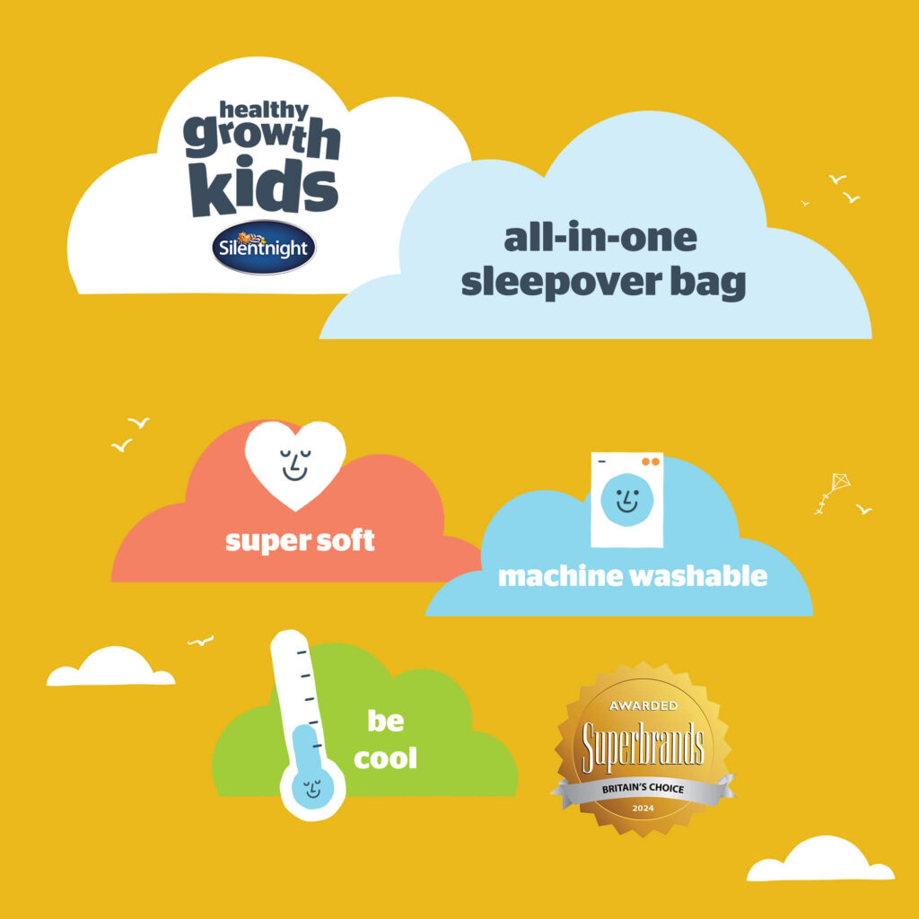 Drift off to dreamland with the Silentnight Healthy Growth All-in-one Sleepover Bag. Combining a sleeping bag and built-in pillow for comfort and convenience. Available in 2 fun and vibrant designs; dinosaur and unicorn.