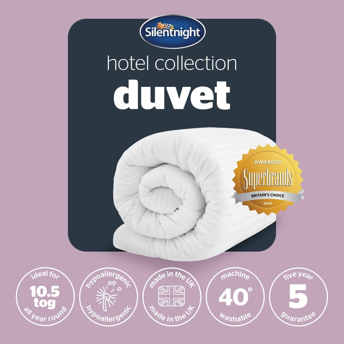 The Silentnight Hotel Collection Duvet is made right here in the UK and come with a 5 year manufacturer’s guarantee for peace of mind. The duvet is hypoallergenic which means it is kind to skin and does not include any contents likely to cause allergies. You can keep enjoying hotel quality night after night as it’s are fully machine washable.