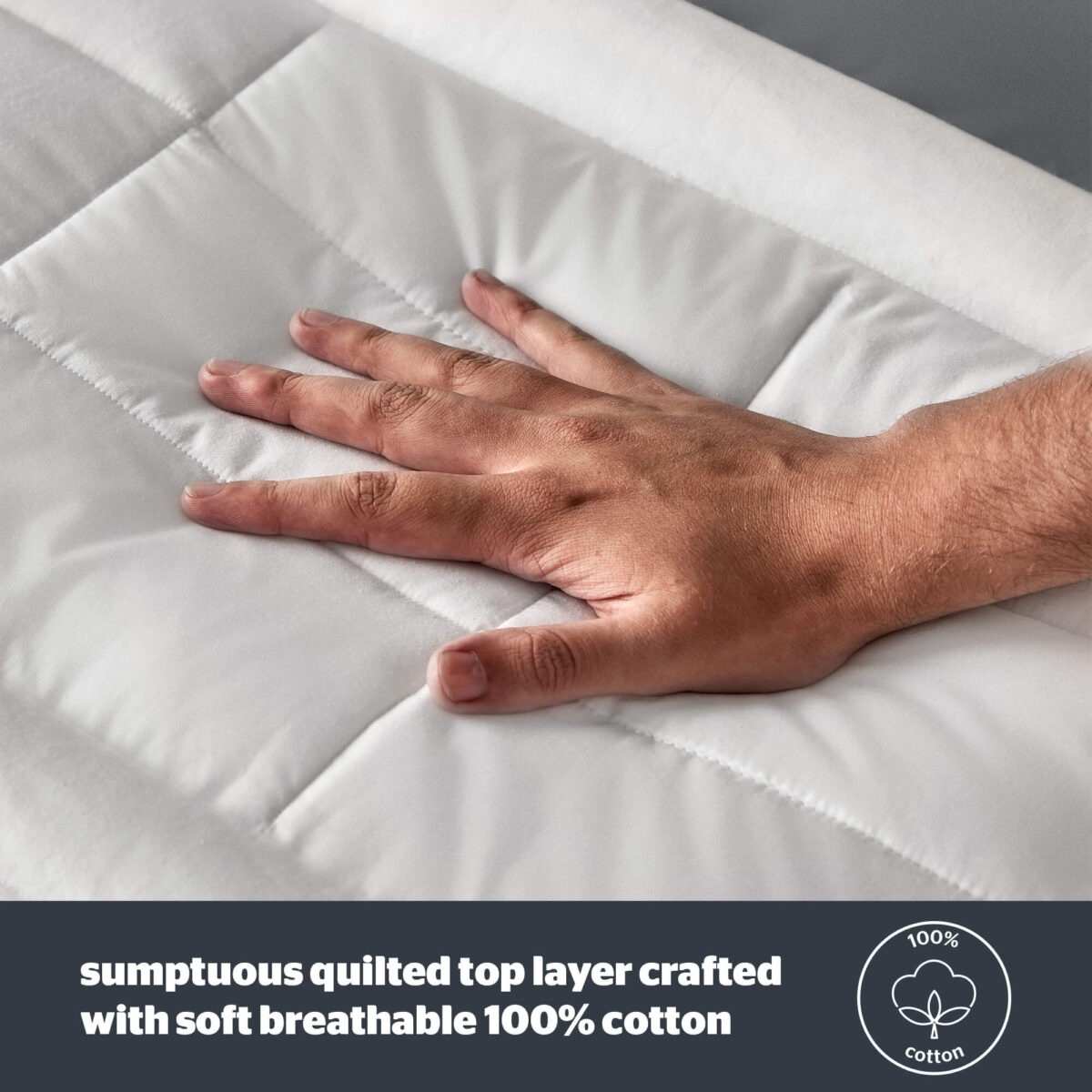 - SUMPTUOUS & BREATHABLE: Crafted with a soft quilted 100% cotton cover for added breathability and luxury.