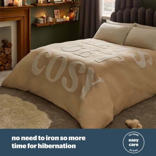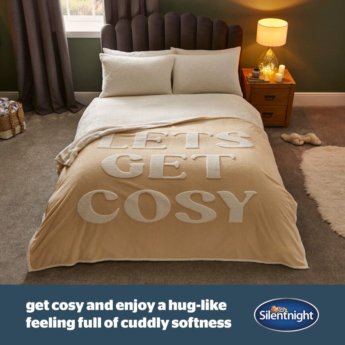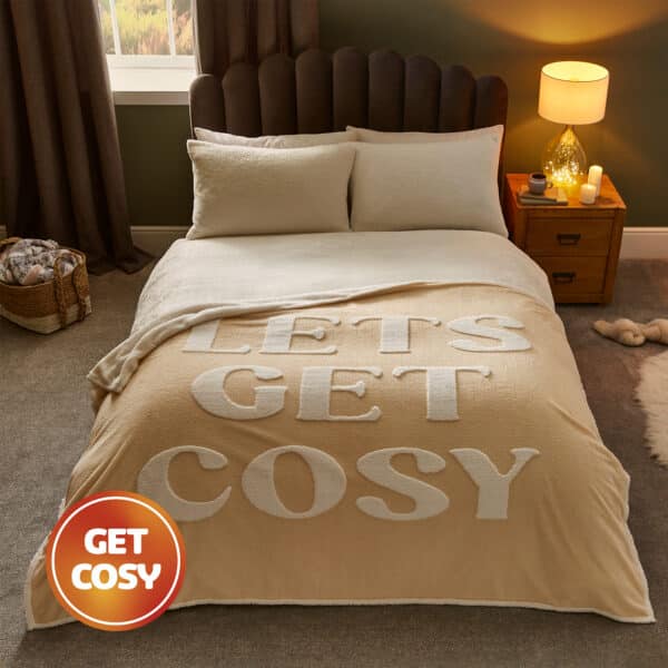 - GRAPHIC TEXT DESIGN: The design features the bold lettering “Let's Get Cosy” across the front of the blanket, perfect for winter.