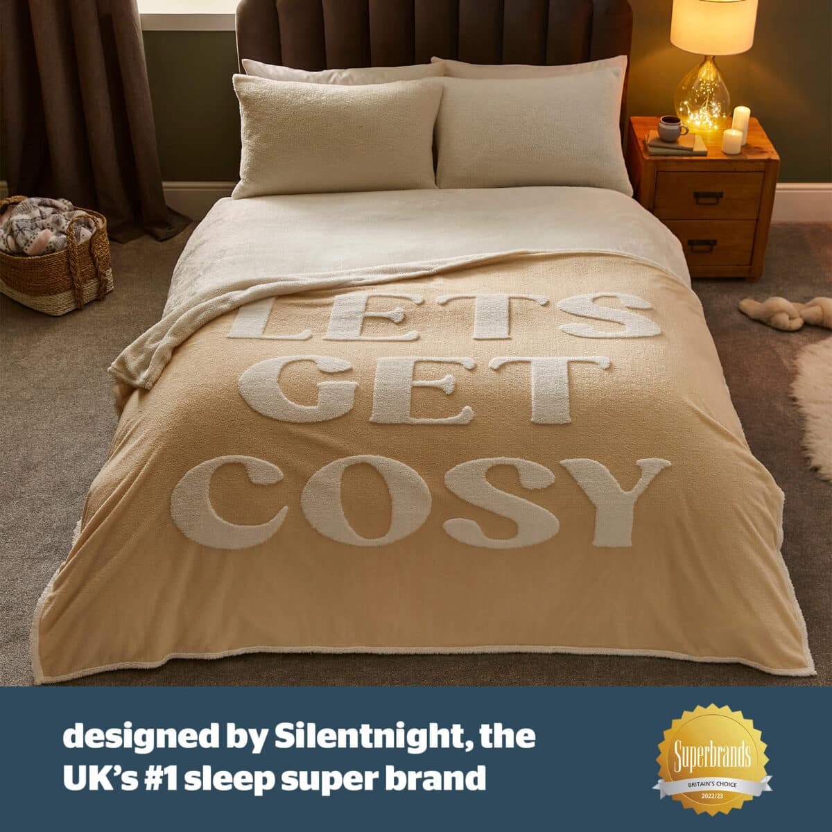 The blanket is super-sized for ultimate comfort, measuring 200 x 150cm. The design features the bold lettering “Let’s Get Cosy” across the front of the blanket, ideal for winter.