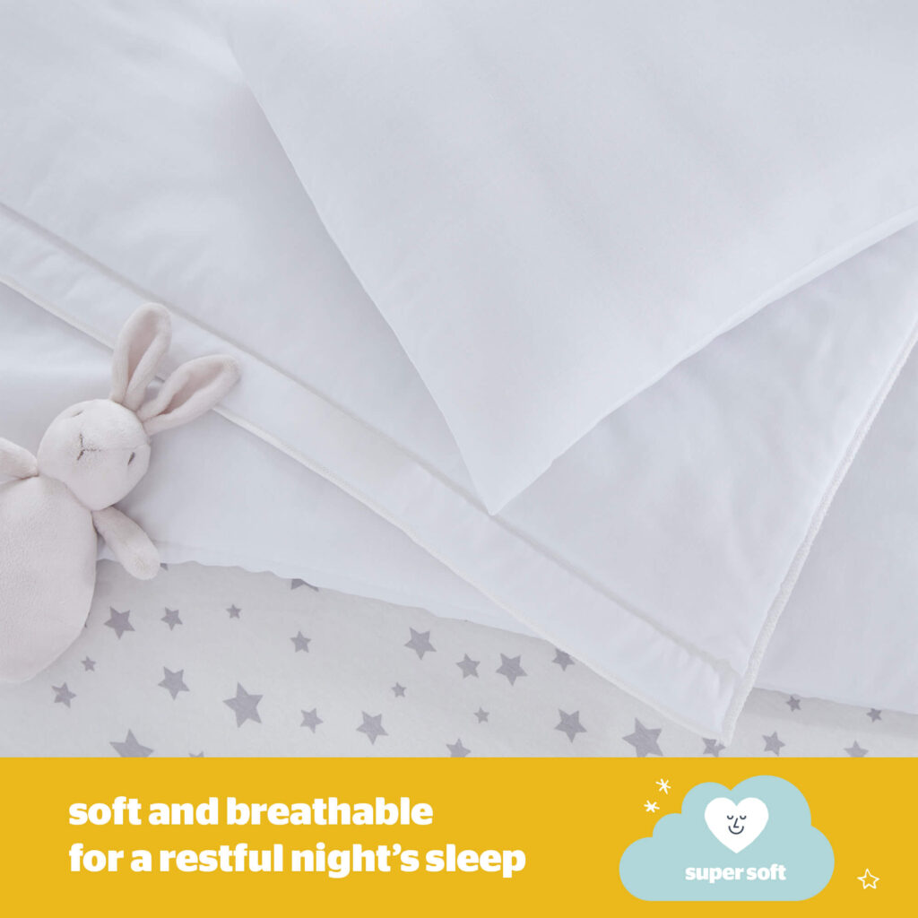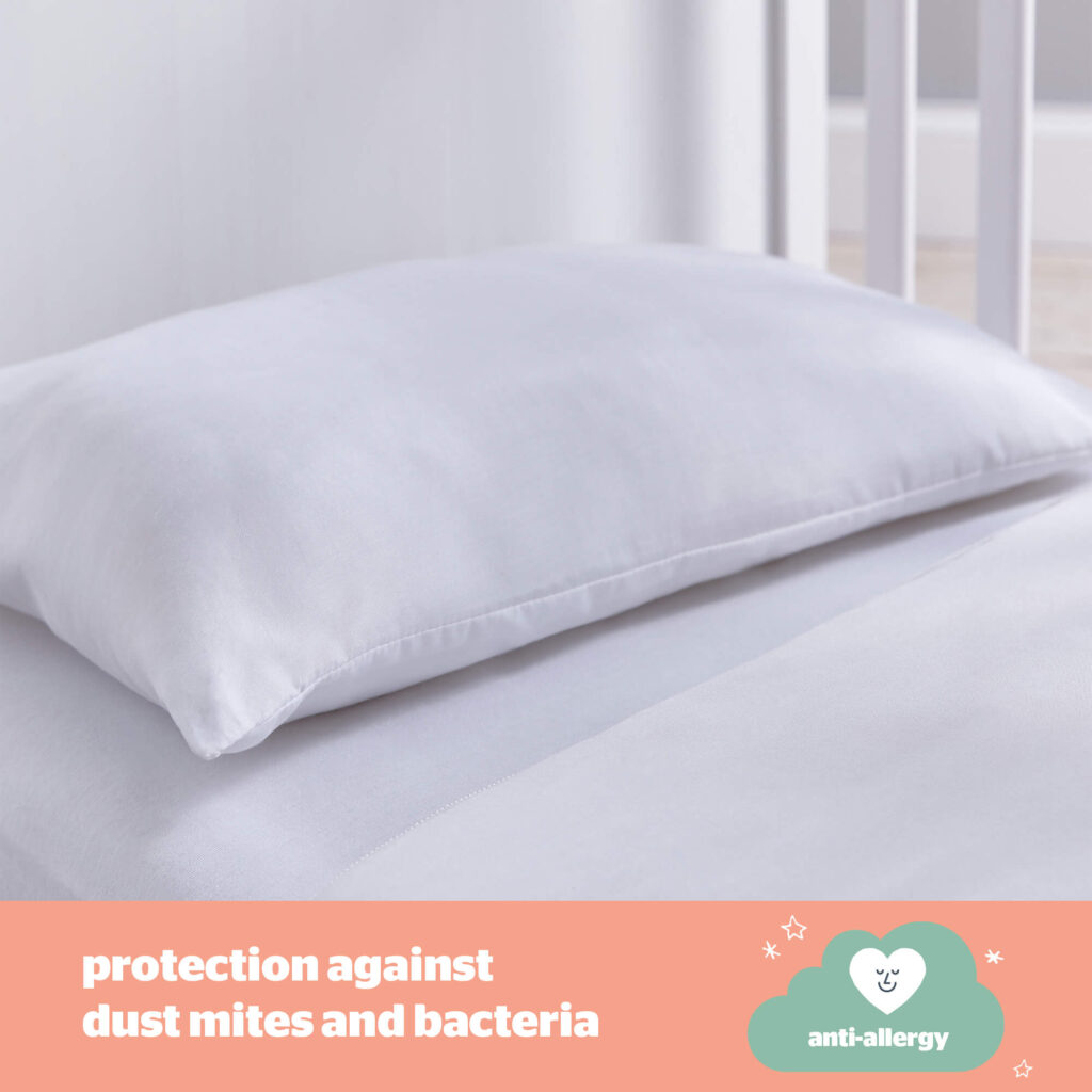 The Safe Nights Anti-allergy Cot Bed Pillow by Silentnight is soft and slim and has been uniquely designed with your little one’s comfort in mind. Little heads and necks need a different pillow height and support to adults, so we have designed this to be uniquely slim and softly supportive. Filled with anti-allergy fibres that keep bacteria at bay for a comfortable, hygienic sleep. Suitable for 12 months+.