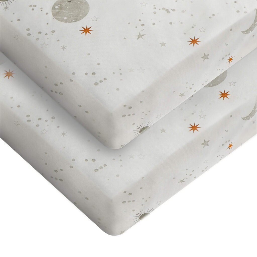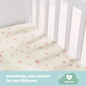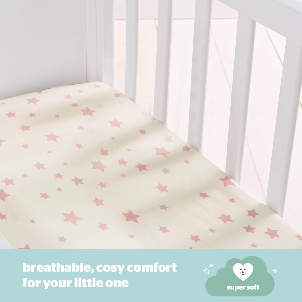 Our handy 2 pack of fitted sheets feature elasticated edges for a secure and safe fit and are made from 100% soft and breathable cotton.