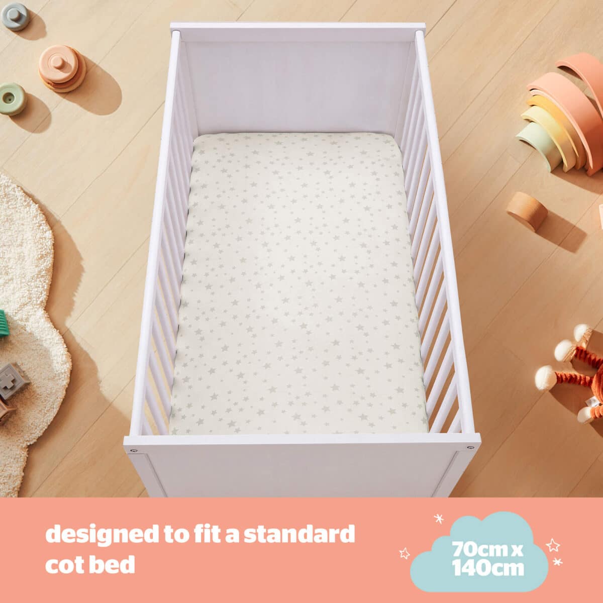 - SECURE FIT: It's important that sheets fit neatly around your baby's mattress for comfort and safety. The elasticated corners ensure a snug fit over your Cot Bed's mattress.