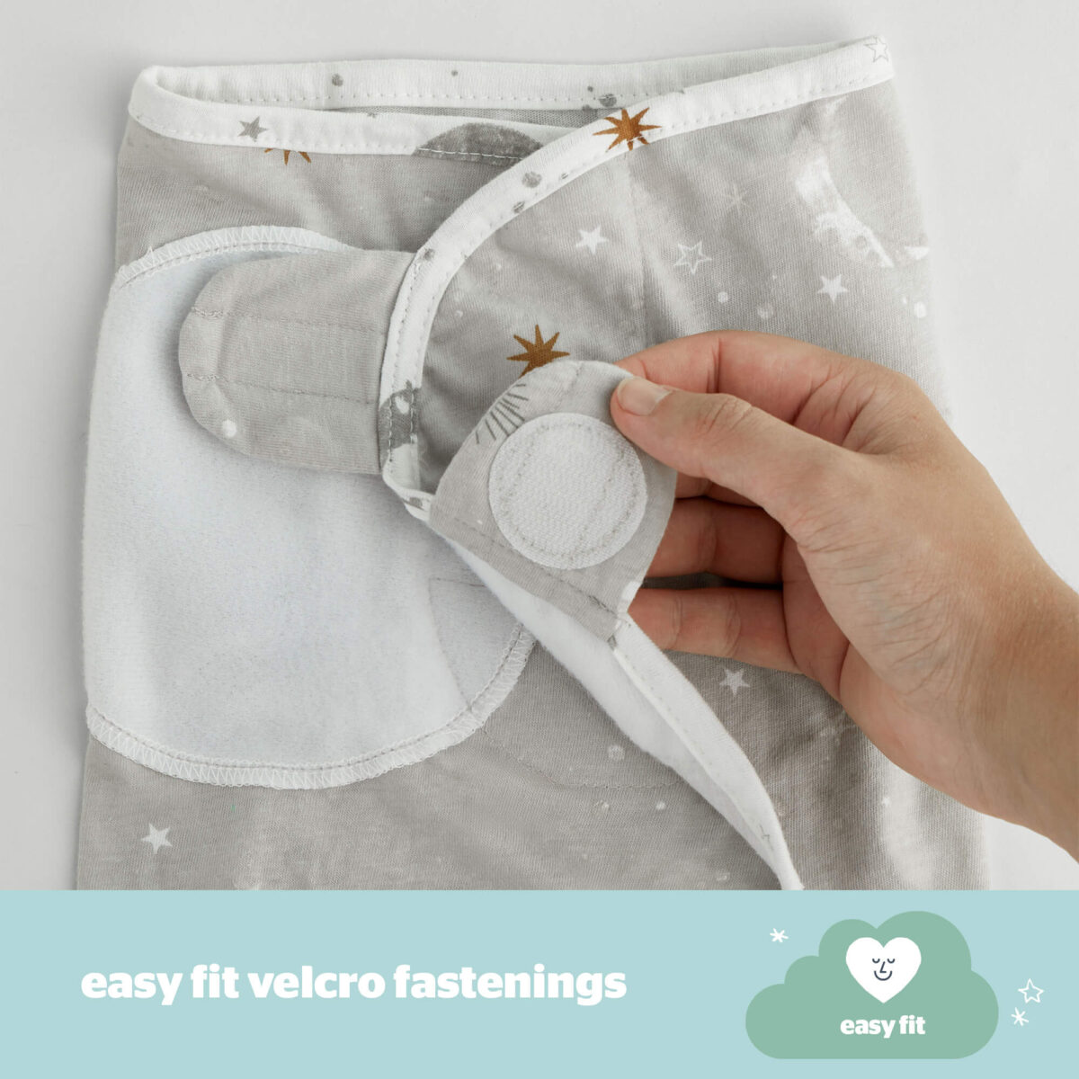 - EASY USE: The easy-fit Velcro patches make swaddling a doddle! Simply place baby into the centre of the swaddle wrap and fold the swaddle wings, securing with the easy-fit Velcro patches.