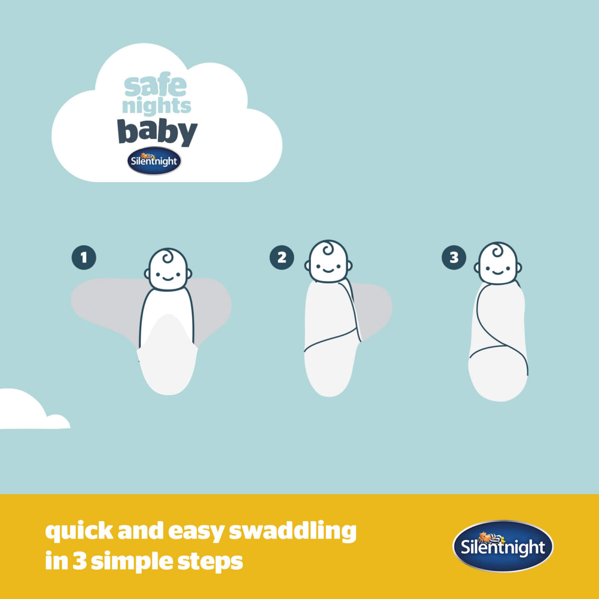 - Ensure that baby sleeps on their back and never their front or side whilst swaddled.