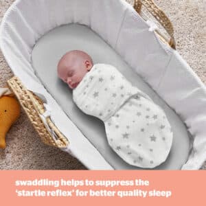 - CALMING COMFORT FOR BETTER SLEEP: Our swaddle wraps help to recreate the safe and comfortable feeling of the womb, helping your baby to settle into a calm sleep. Swaddling helps to suppress the 'startle reflex' which is a common sleep disturbance in babies, so your little one can enjoy longer, less interrupted sleeps.