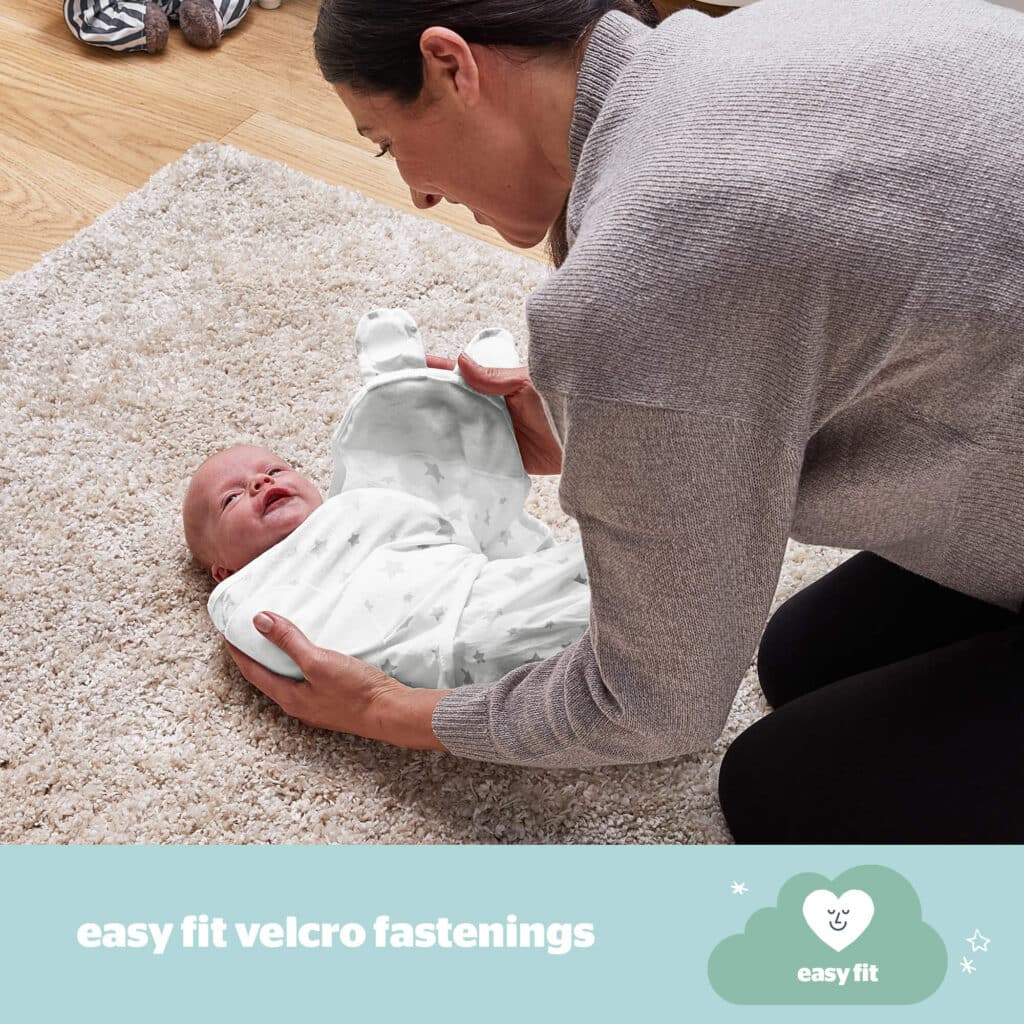 - EASY USE: The easy-fit Velcro patches make swaddling a doddle! Simply place baby into the centre of the swaddle wrap and fold the swaddle wings, securing with the easy-fit Velcro patches.
