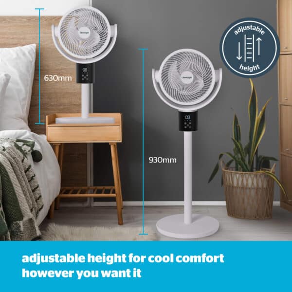 The Silentnight Airmax Pro360 Fan features 3 fan blades and 12 powerful speed settings, to keep you cool and comfortable. Our quietest yet most powerful fan, from just 30dbA, you can experience powerful cooling for an undisturbed and cool night’s sleep. Also featuring a 15hour timer for peace of mind. The omni-directional oscillation means you will feel cooling comfort everywhere. Turning in every direction, the 140° horizontal and 90° vertical oscillation boosts air circulation around the entire room. This fan can be easily moved from room to room and also features 2 adjustable heights, for the best position and location. Featuring an easy-to-use remote control and digital LED display, for ultimate convenience and control.