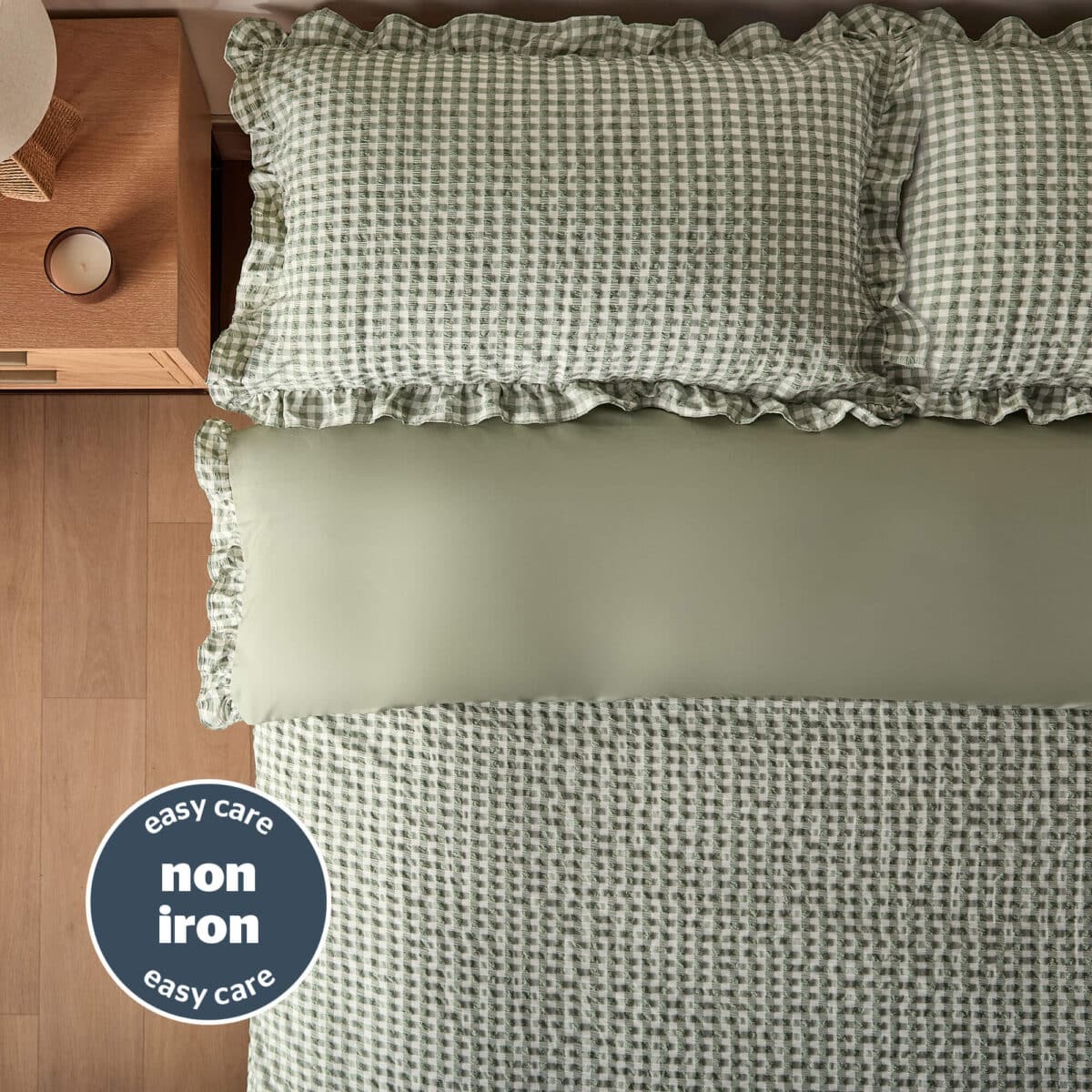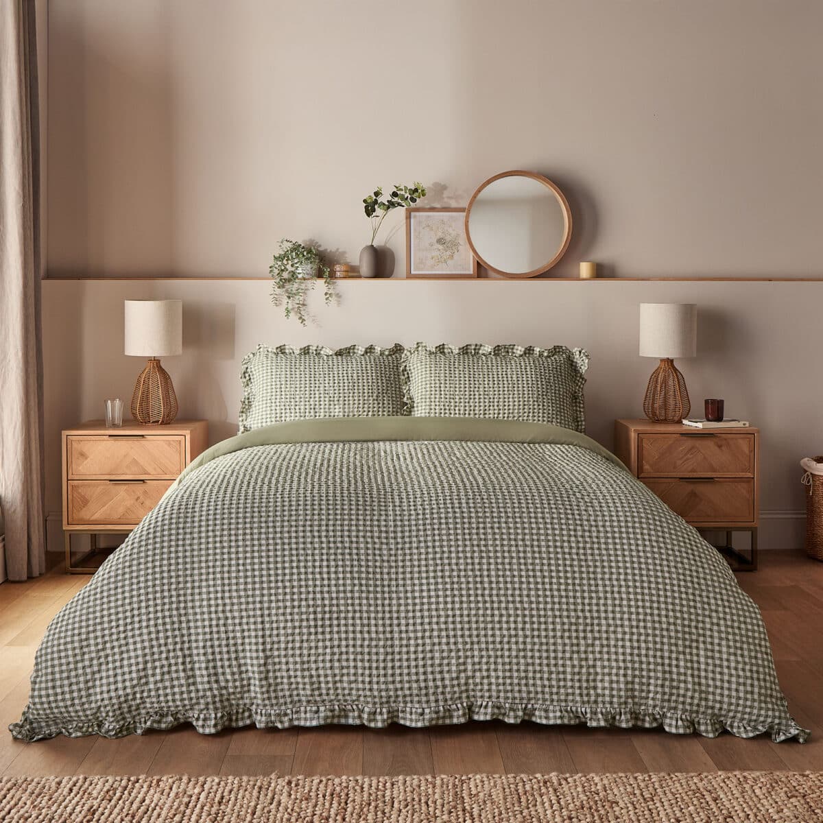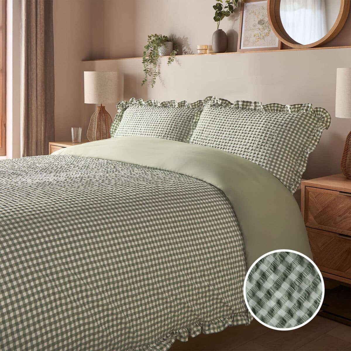 Beautifully crafted from luxuriously soft seersucker fabric that feels delicate to the touch for great comfort whilst you sleep. Delicate ruffle edge detailing and sage gingham design.