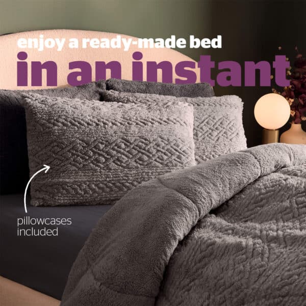 Snuggle into a cocoon of ultra-soft comfort with our stylish cable knit teddy fleece texture. This ready-made duvet comes with a built-in cover, making bed changes a hassle-free dream.