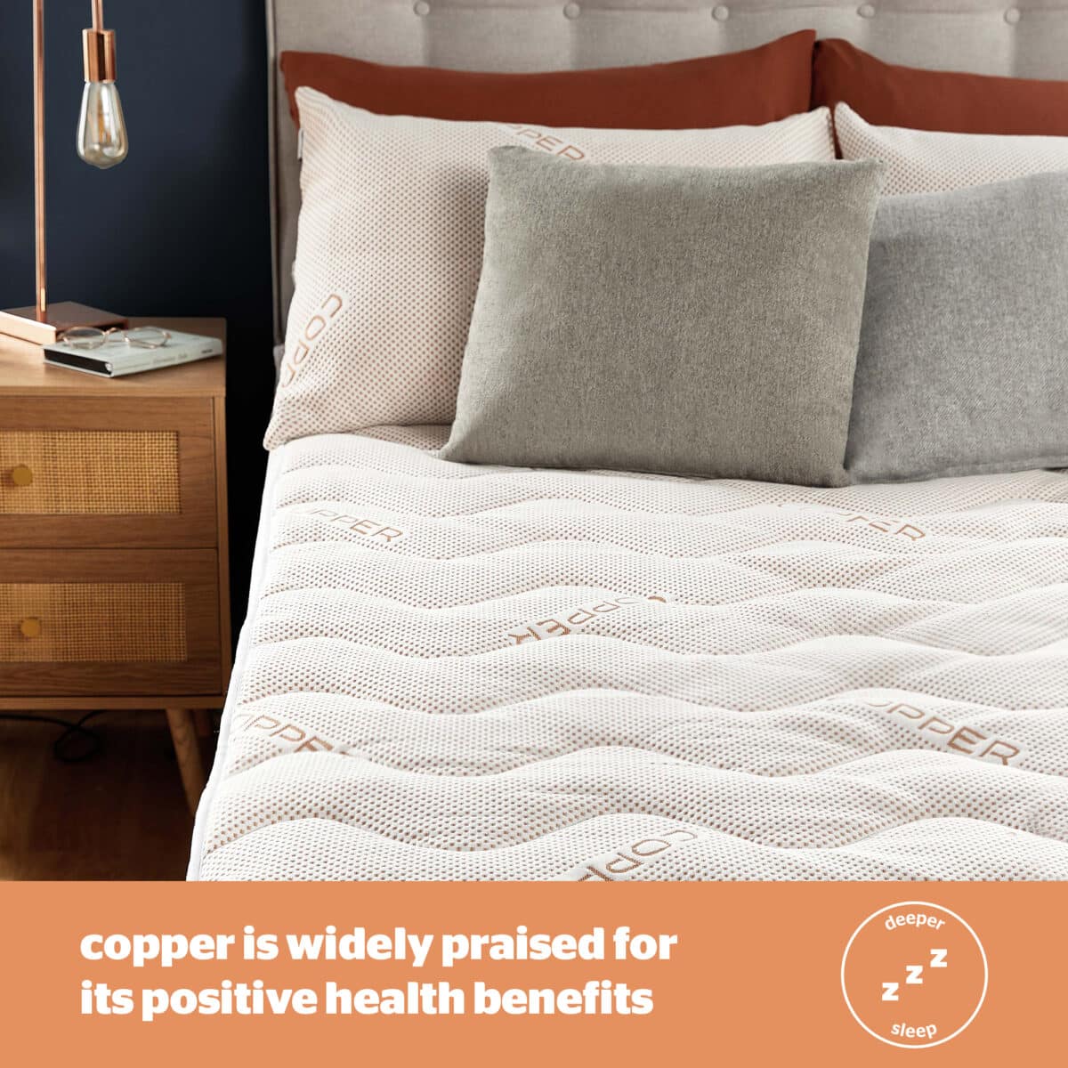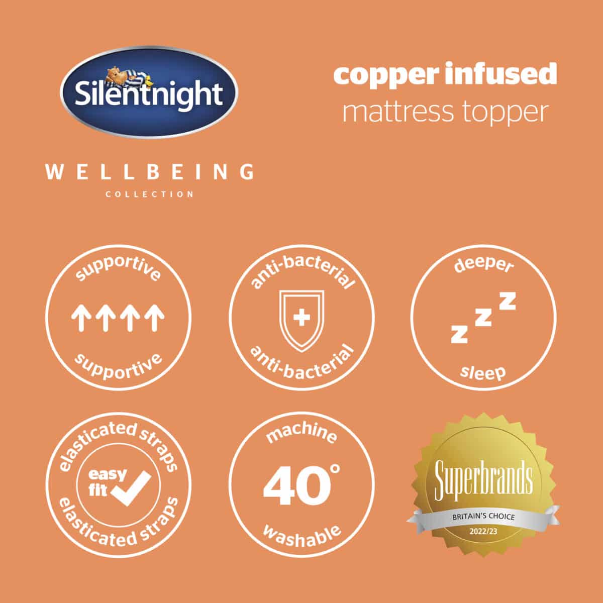 - NATURALLY HEALING: Copper is widely praised for its positive health benefits and believed by many to help relieve joint pain and improve circulation. The Silentnight Copper Infused Mattress Topper contains approximately 3 times more copper than some alternatives available.