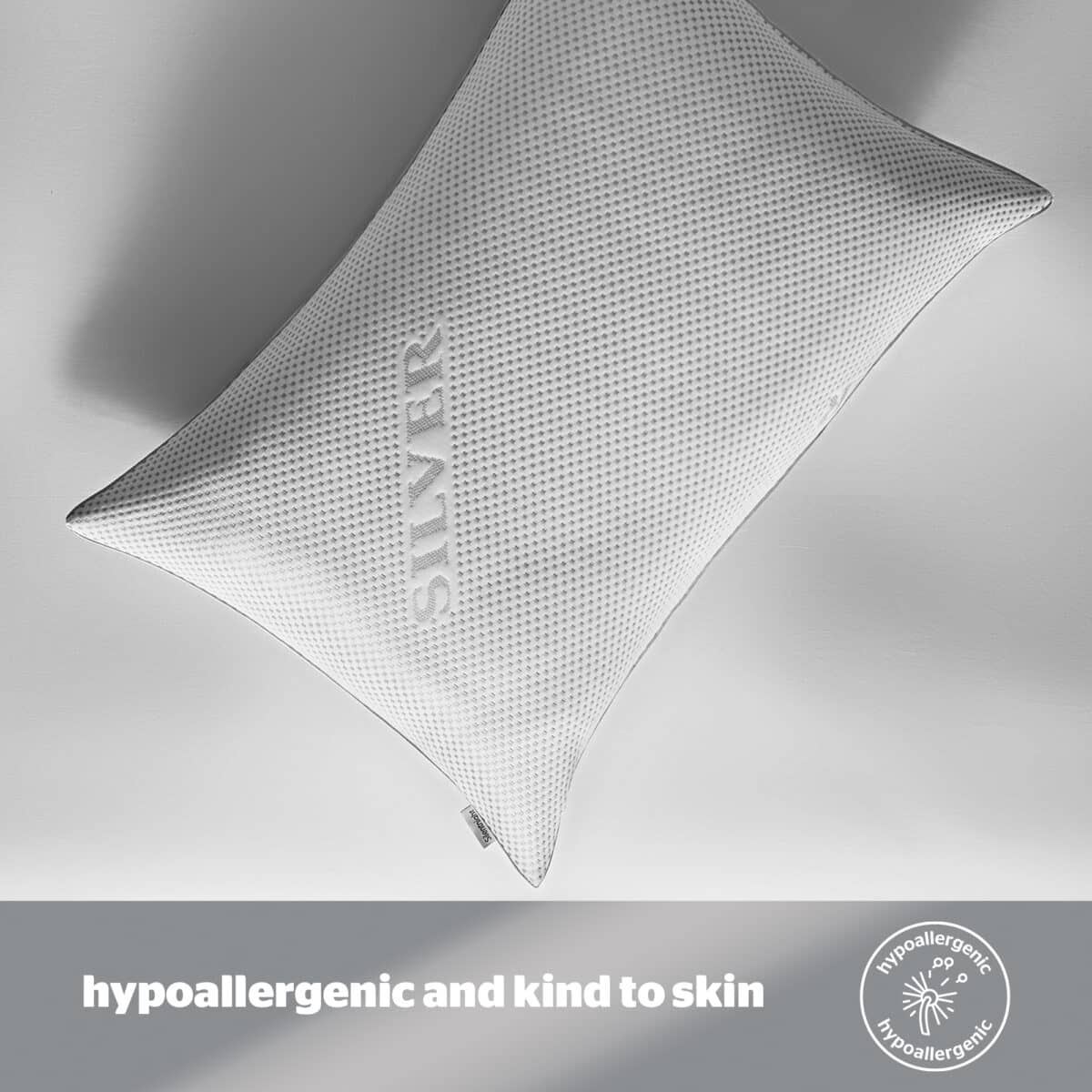 Naturally antibacterial silver in the pillow is gentle on the skin, helping to reduce redness and breakouts and promoting a more hygienic sleep environment. The pillow is hypoallergenic which means it does not include any contents likely to cause allergies.