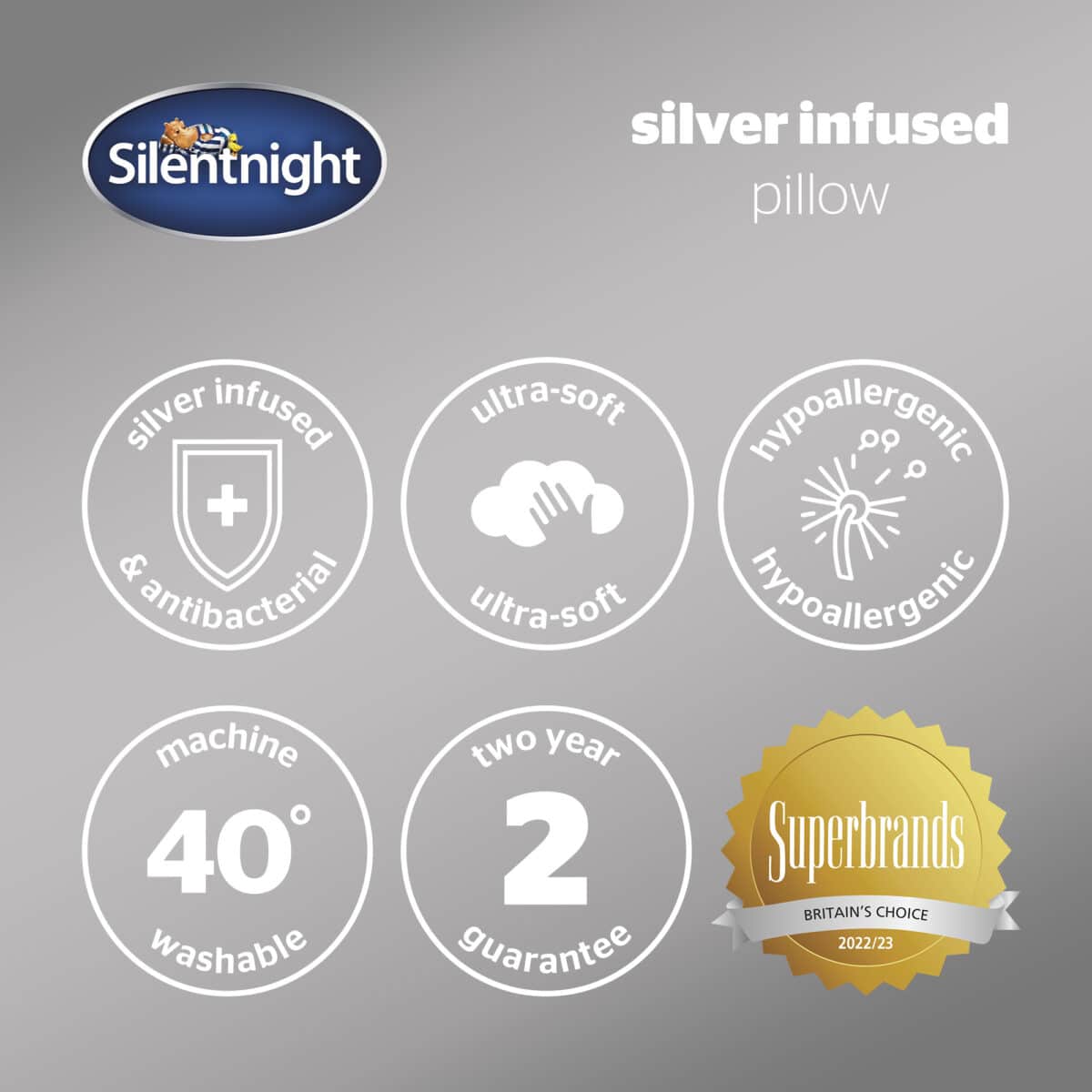 The Silentnight Wellbeing Silver Infused Pillow has been specifically designed with your sleep wellness in mind. Finished with a luxurious, silver-infused cover that offers natural health and wellness benefits, the pillow promotes a fresh-feel night after night so you can wake up feeling rejuvenated.
