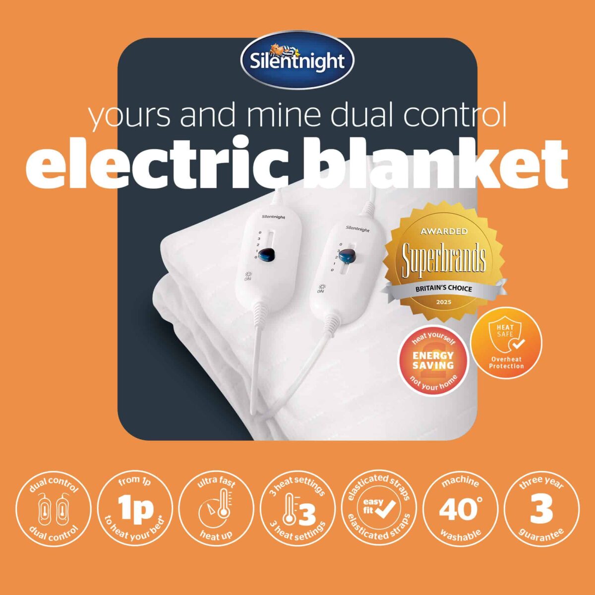 The Silentnight Yours & Mine Electric Blanket is an energy efficient and affordable way to stay warm for less. Pre- heating your bed for 1 hour on a low heat setting costs from as little as 1p, so you can afford to cosy up night after night. As sleep experts we recommend turning off the appliance before falling asleep to regulate your core temperature for a less disturbed sleep.