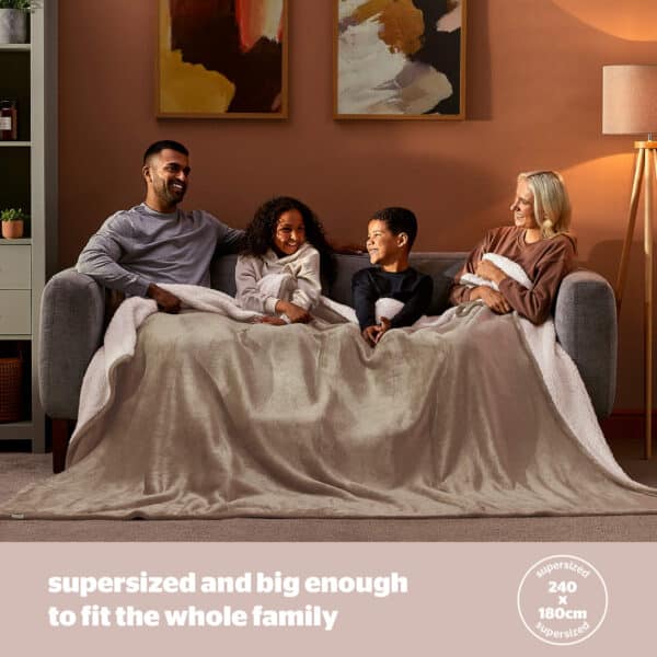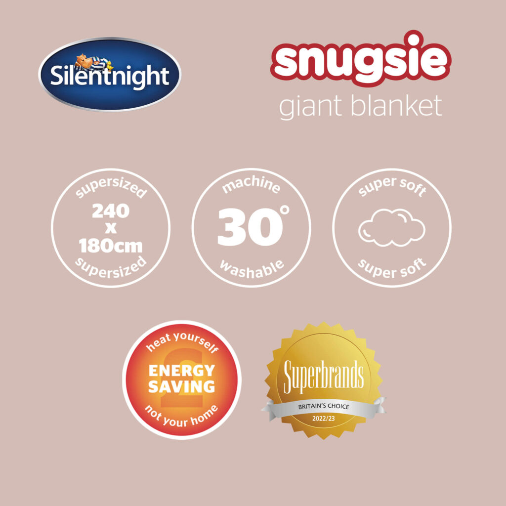 The Silentnight Snugsie Giant Blanket is the ultimate snuggly accessory for your home. Sumptuously soft, cuddly comfort to keep you warm and cosy as you relax and big enough to fit the whole family. The blanket is super-sized for ultimate comfort, measuring 180 x 240cm which is bigger than a king size bed!